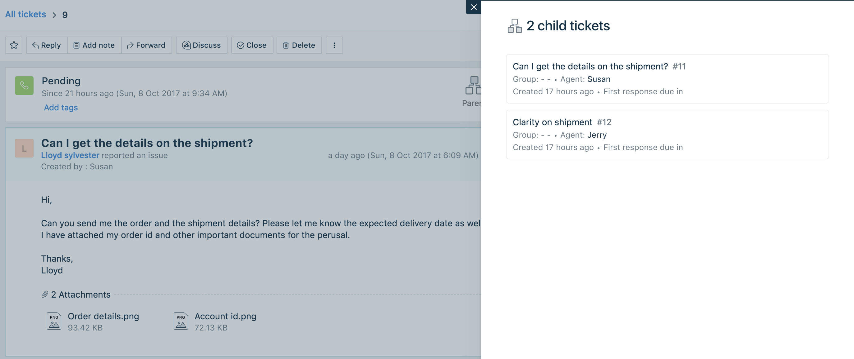 - By clicking on the associated Child tickets count, the list of tickets will be displayed along with some additional details like Child ticket Status, Priority, Agent, etc.