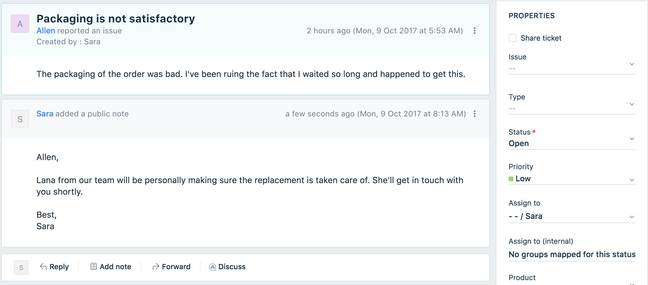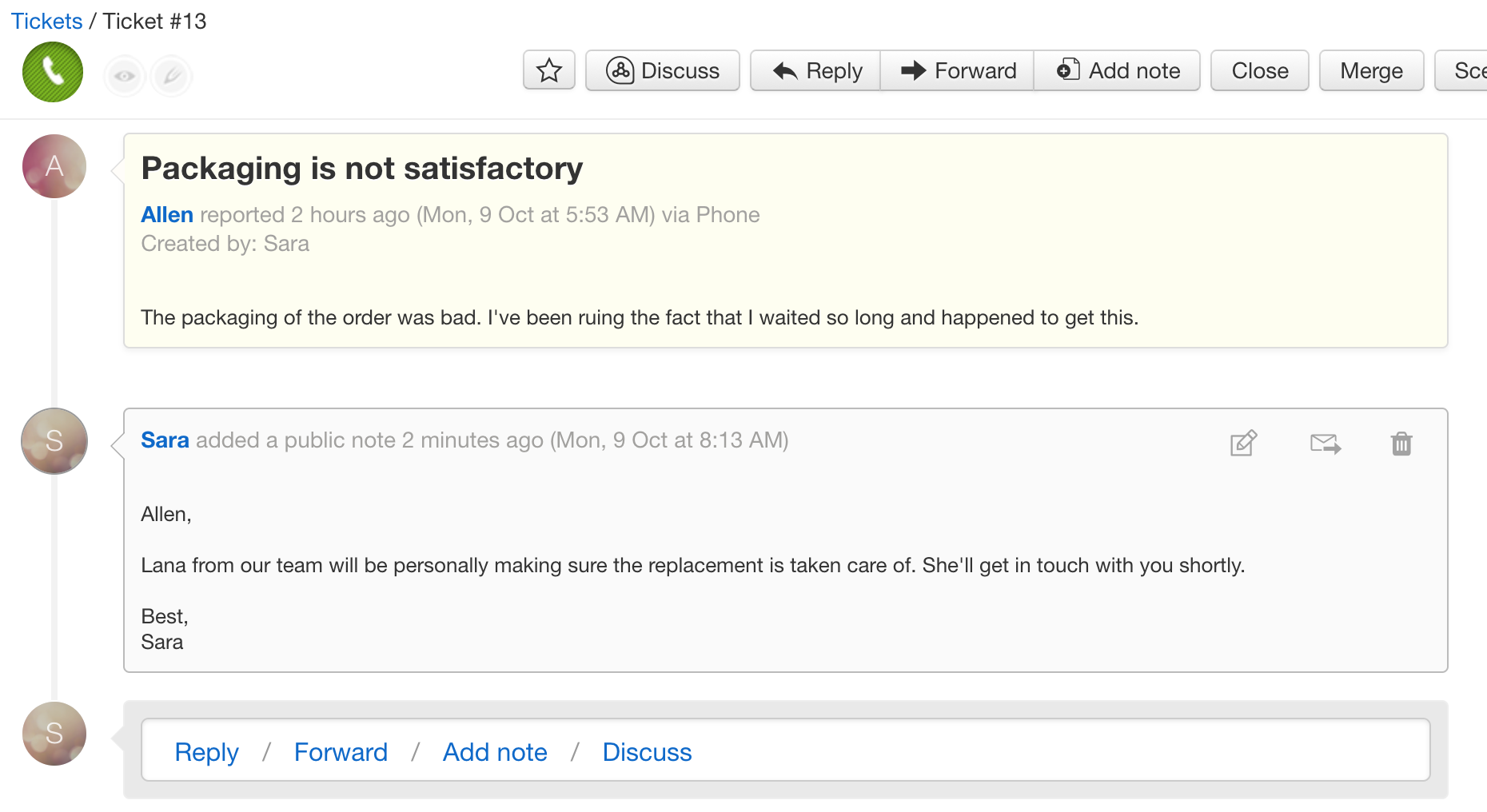 Sara, the support agent to whom the ticket was assigned, gets Lana from the grievances team in touch to replace the order with a new package.