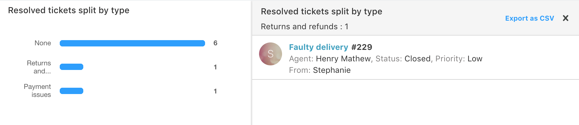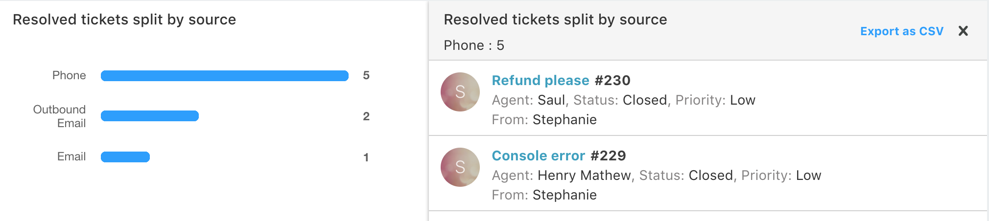 You will be able to deep dive into one particular property value by clicking on the corresponding bar. It will bring up a list of tickets that currently have that value. For example, if you click on the 'Email' bar in 'Resolved tickets split by source', you will be able to see all the tickets created via email that was resolved during the selected time period. This way, if you see an abnormal value for a metric, you can quickly find out what is causing it and take necessary actions.