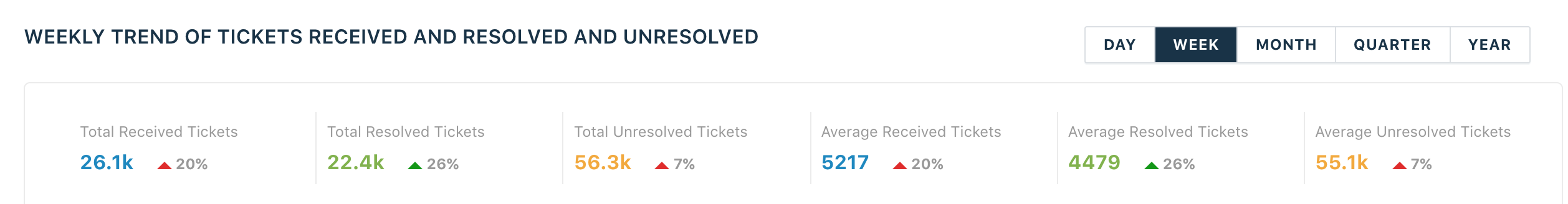 The daily trend of tickets received, resolved and unresolved would show up for up to 31 days, the weekly trend of tickets up to 31 weeks and so on.