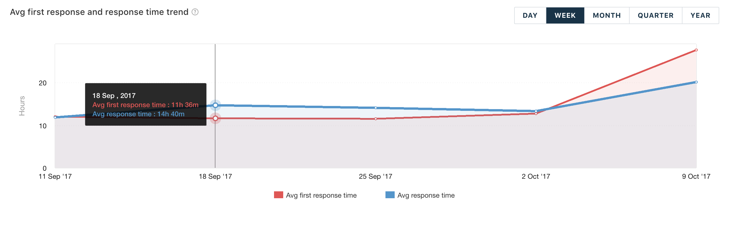 This graph shows the daily/weekly/monthly/quarterly/yearly trend of avg first response time and avg response time. When you hover over a data point, you can see the average time taken to send all the first responses in that time period and the average of average time taken to send any response to a requester in that time period.