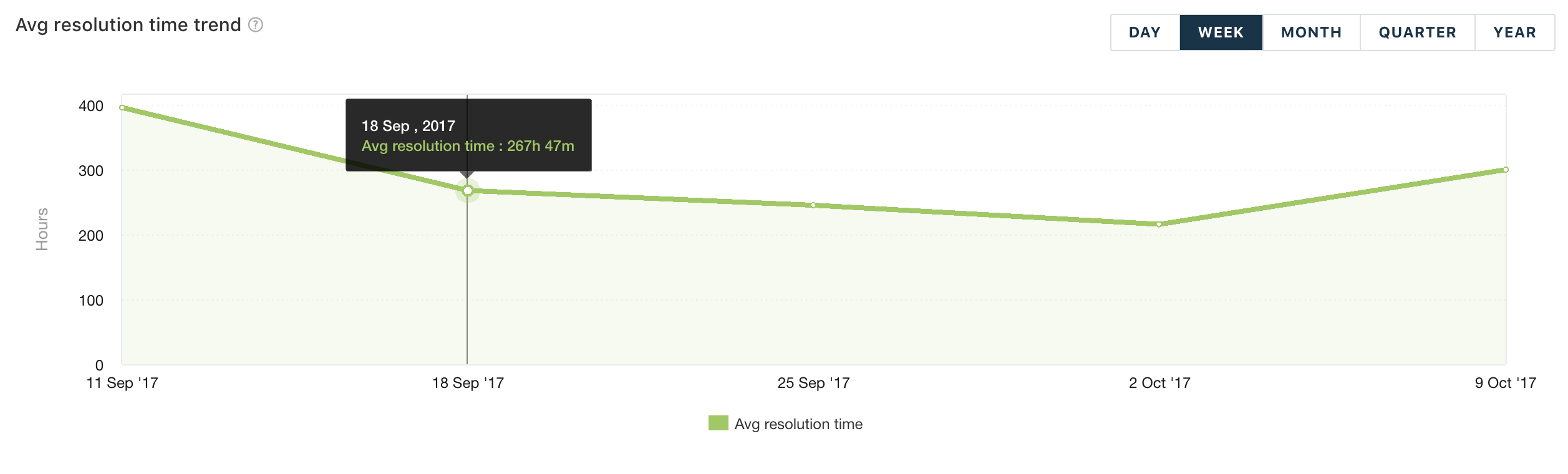 This graph shows the daily/weekly/monthly/quarterly/yearly trend of avg resolution time. When you hover over a data point, you can see the average time taken to resolve tickets in that time period.
