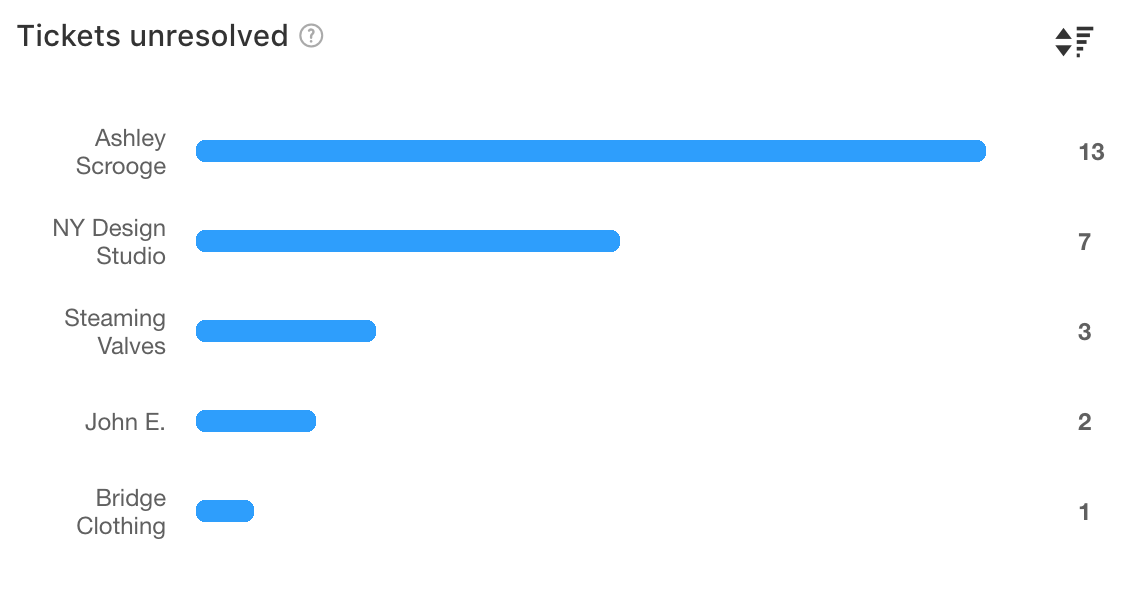 You can toggle between the highest and lowest customers in each metric by clicking on the sort icon in the upper-right. You can also click on each bar in the graph to see the corresponding tickets and take action immediately.