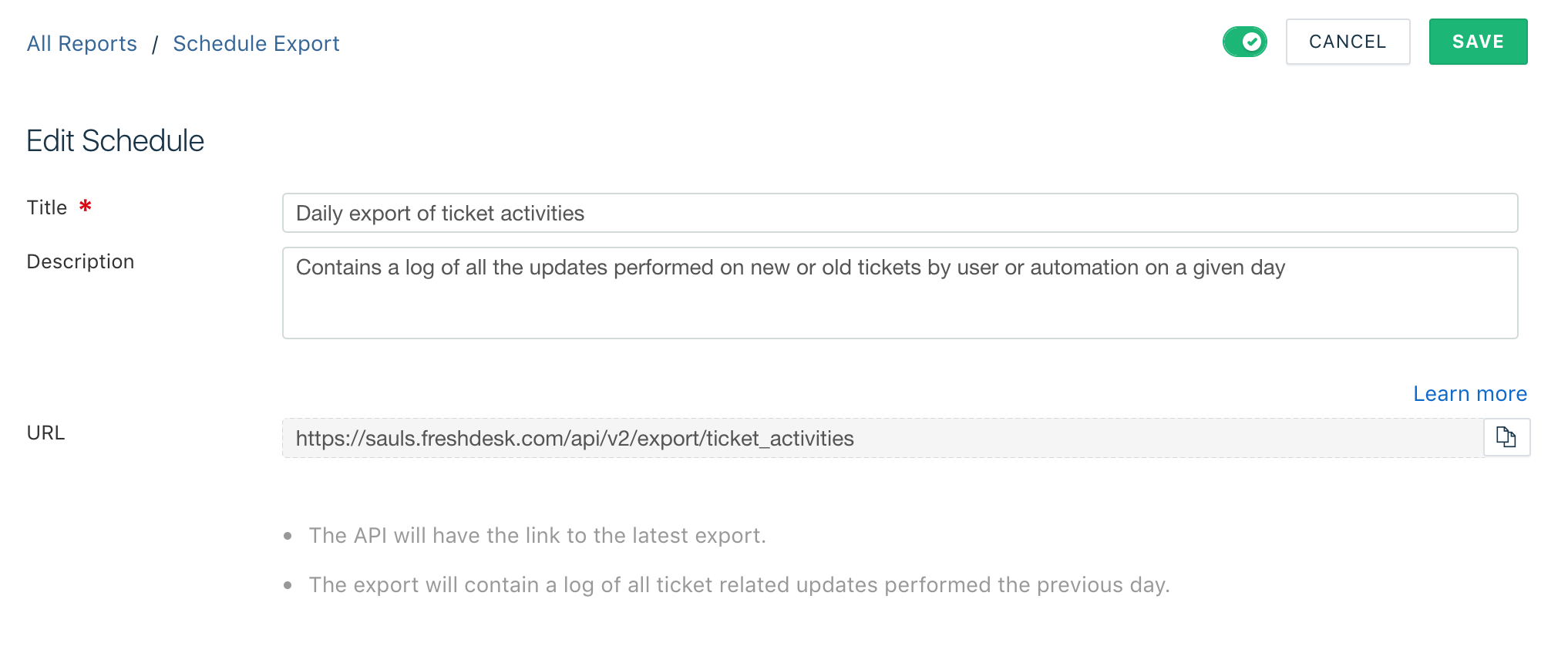 The ticket activities export feature in Freshdesk gives you complete access to key information in your account, so that you can build your reports the way you want. This is done by capturing ticket activities automatically when actions are performed in your helpdesk. The export will contain all the events that took place in all of your tickets the previous day (including the ones performed by Automations).